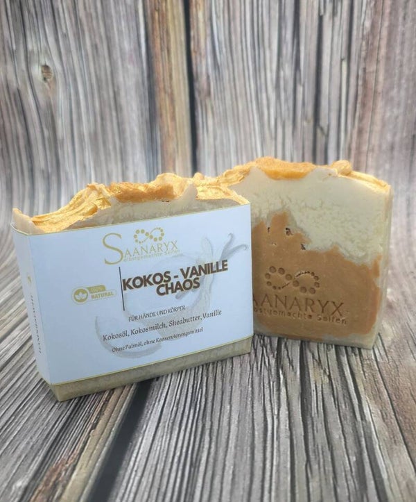Tauche ein in die exquisite Welt des Genusses mit unserer handgemachte Seife "KOKOS-VANILLE CHAOS (RUSTIKO)"148 gr. Diese handgemachte Seife wurde sorgfältig entwickelt, um deiner Haut eine einzigartige und luxuriöse Sinneserfahrung zu bieten.