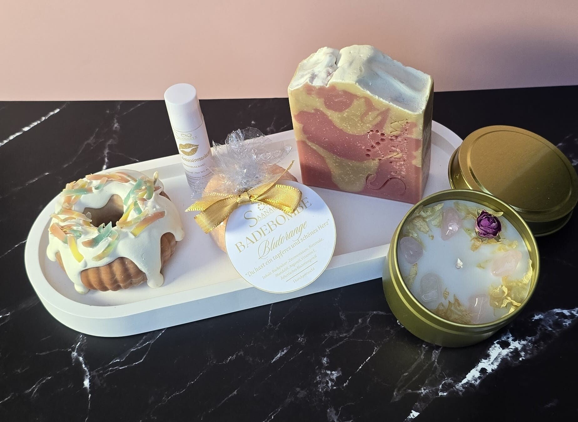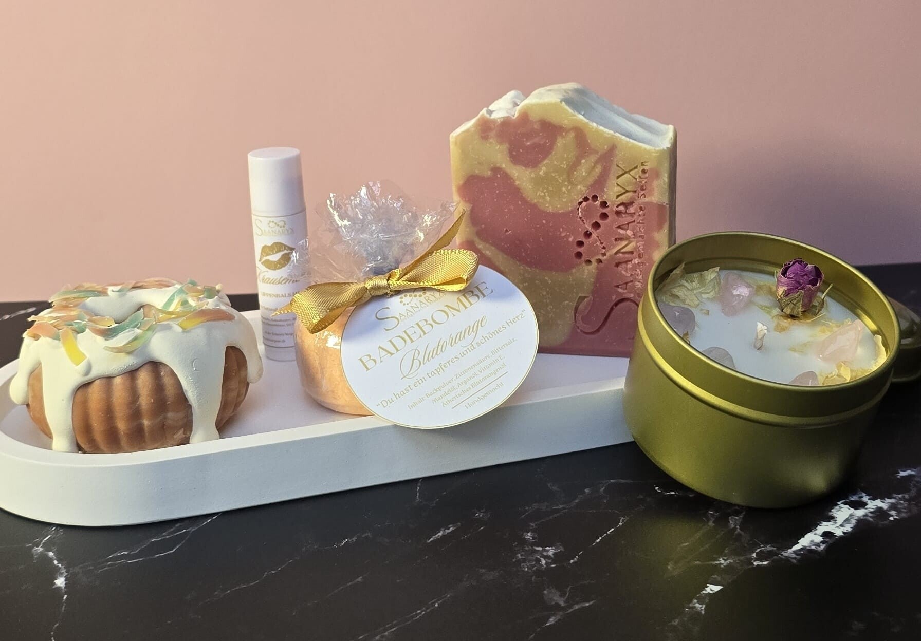 - Inhaltsstoffe: Epsom-Salz, Arganöl, Mandelöl, Vitamin E, ätherisches Öl der Blutorange.