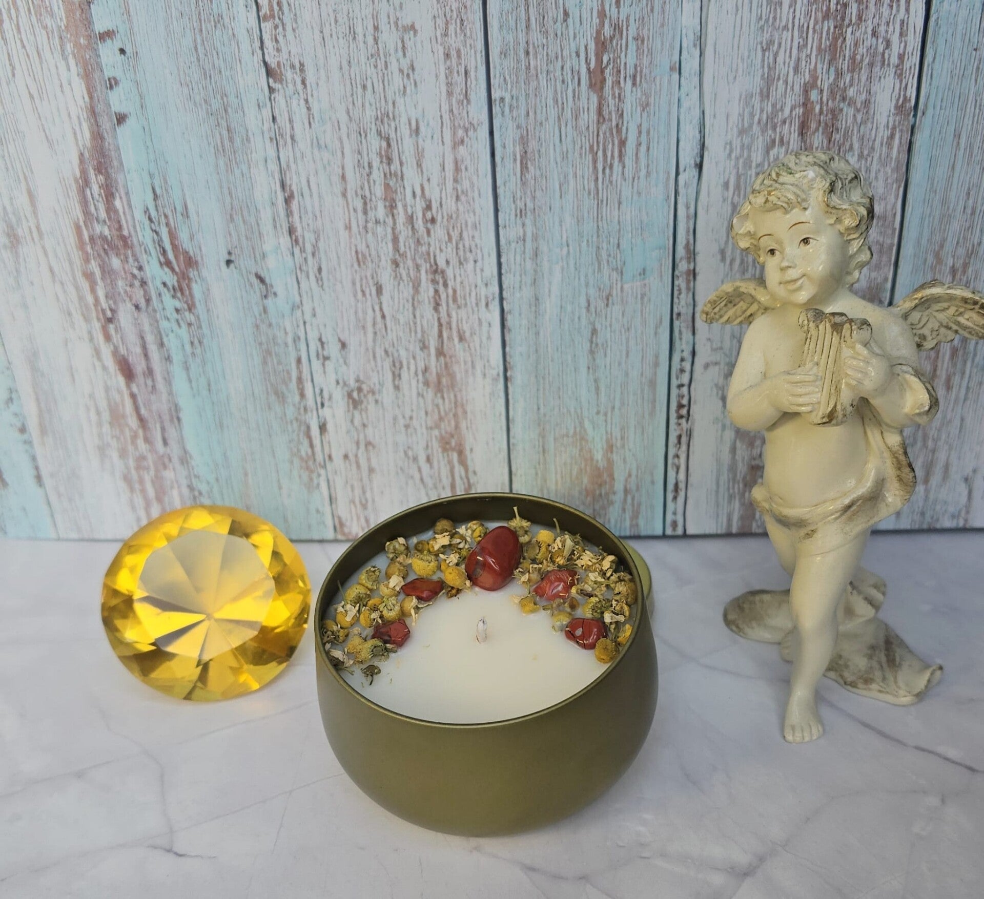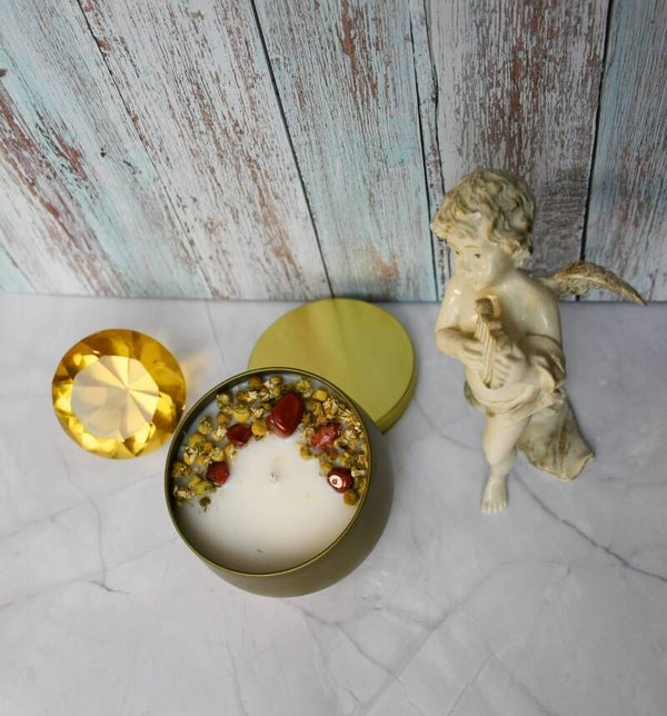 Eine handgemachte Kerze, die Ihren Raum und Ihre Seele bereichert. Diese einzigartige Kreation aus Sojawachs und Kokoswachs kombiniert die harmonischen Düfte von Geranie und Jasmin für ein multisensorisches Erlebnis voller Ruhe, Ausgeglichenheit und Schönheit. Verziert mit getrockneten Kamillenblüten und rotem Jaspis, bringt sie nicht nur optische Eleganz, sondern auch spirituelle Energie und Erneuerung.