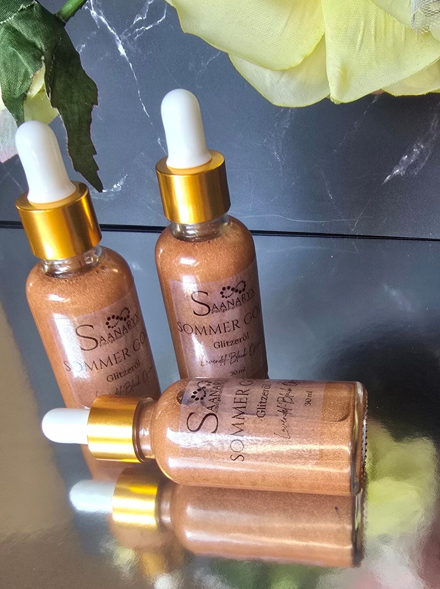 SOMMER GOLD – Glitzeröl ist ein natürliches Trockenöl, das deine Haut intensiv pflegt, geschmeidiger macht und deinen Teint mit einem feinen goldenen Schimmer veredelt.